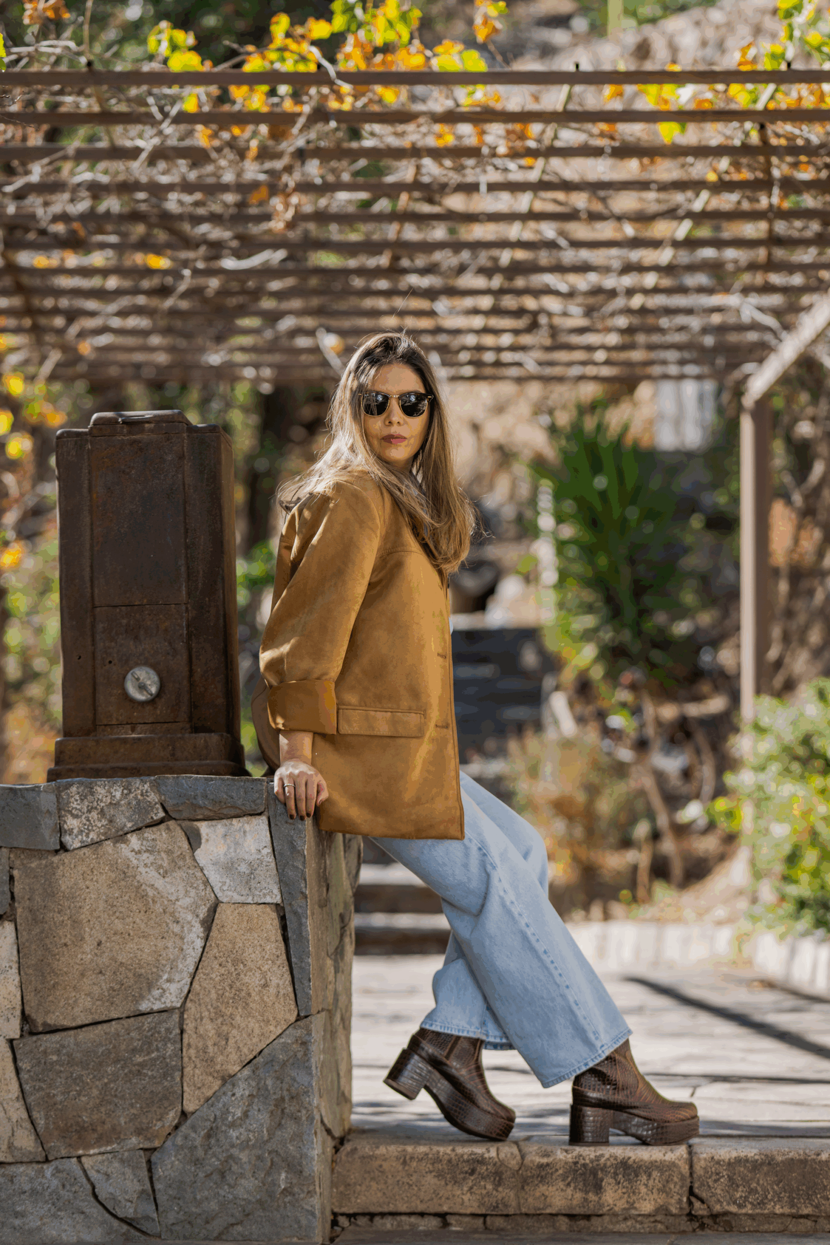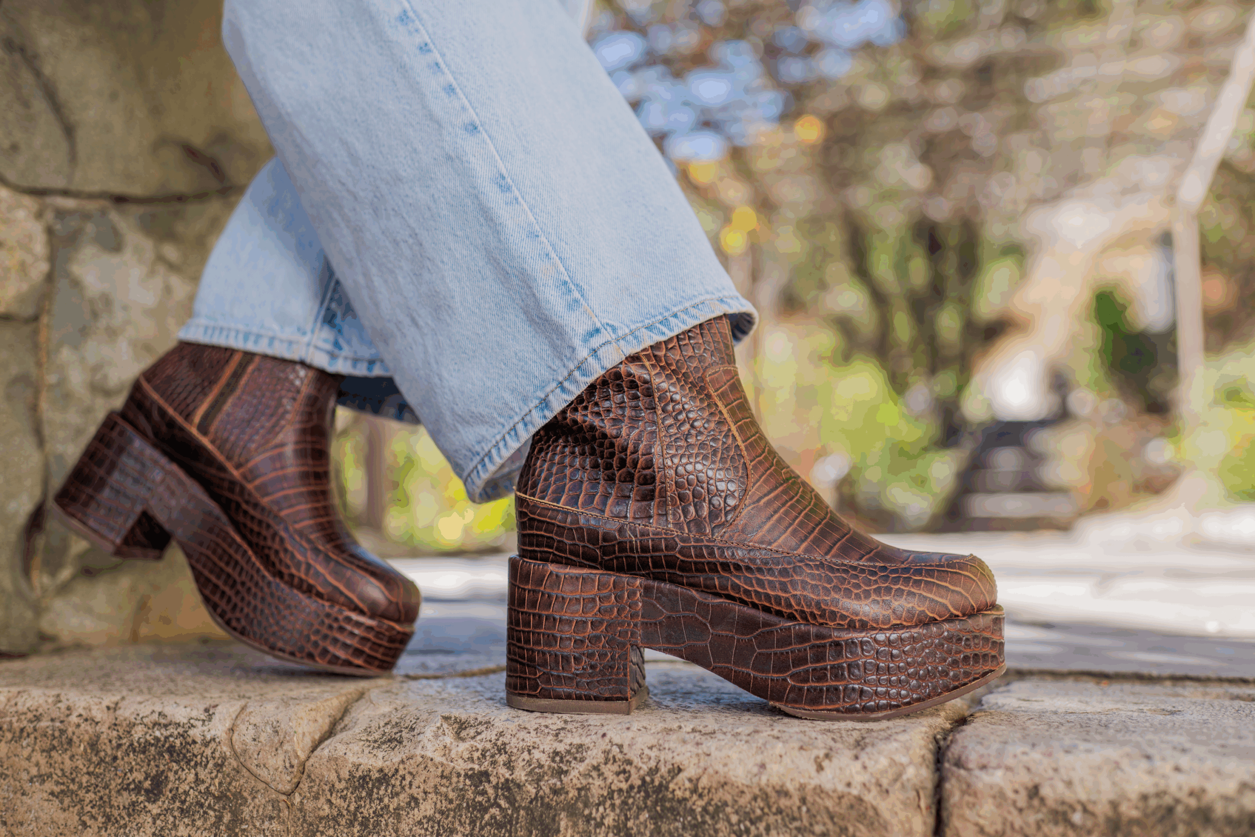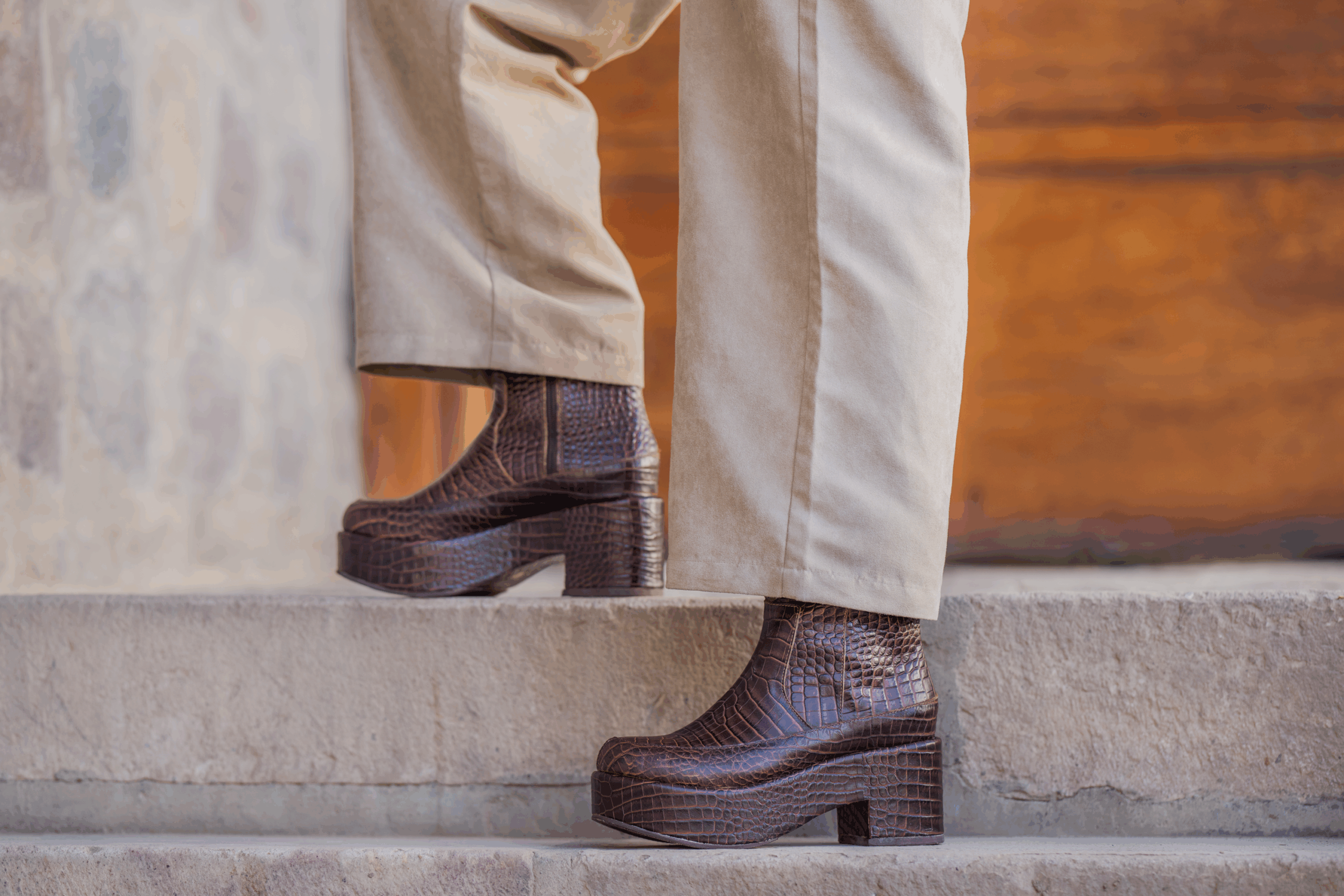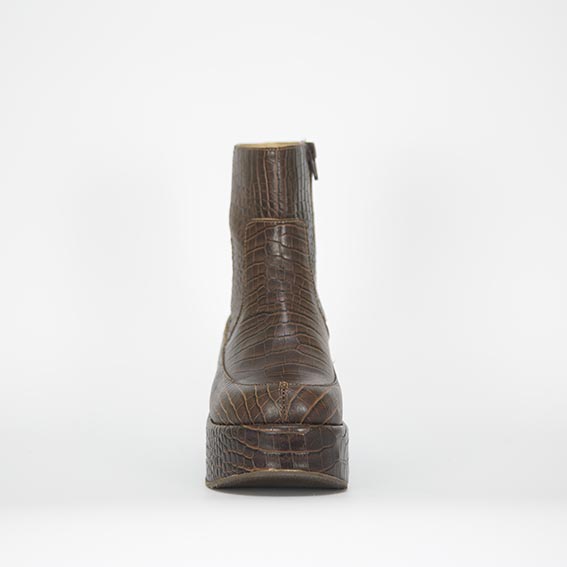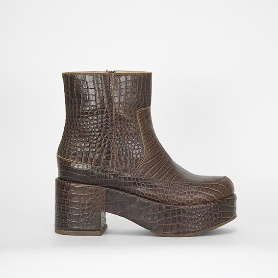 Marian es un botín cautivador con una plataforma de 4 cm., de material liviano (álamo), lo que lo hace muy cómodo . Con cuero textura caimán color chocolate y un taco de 7 cm .